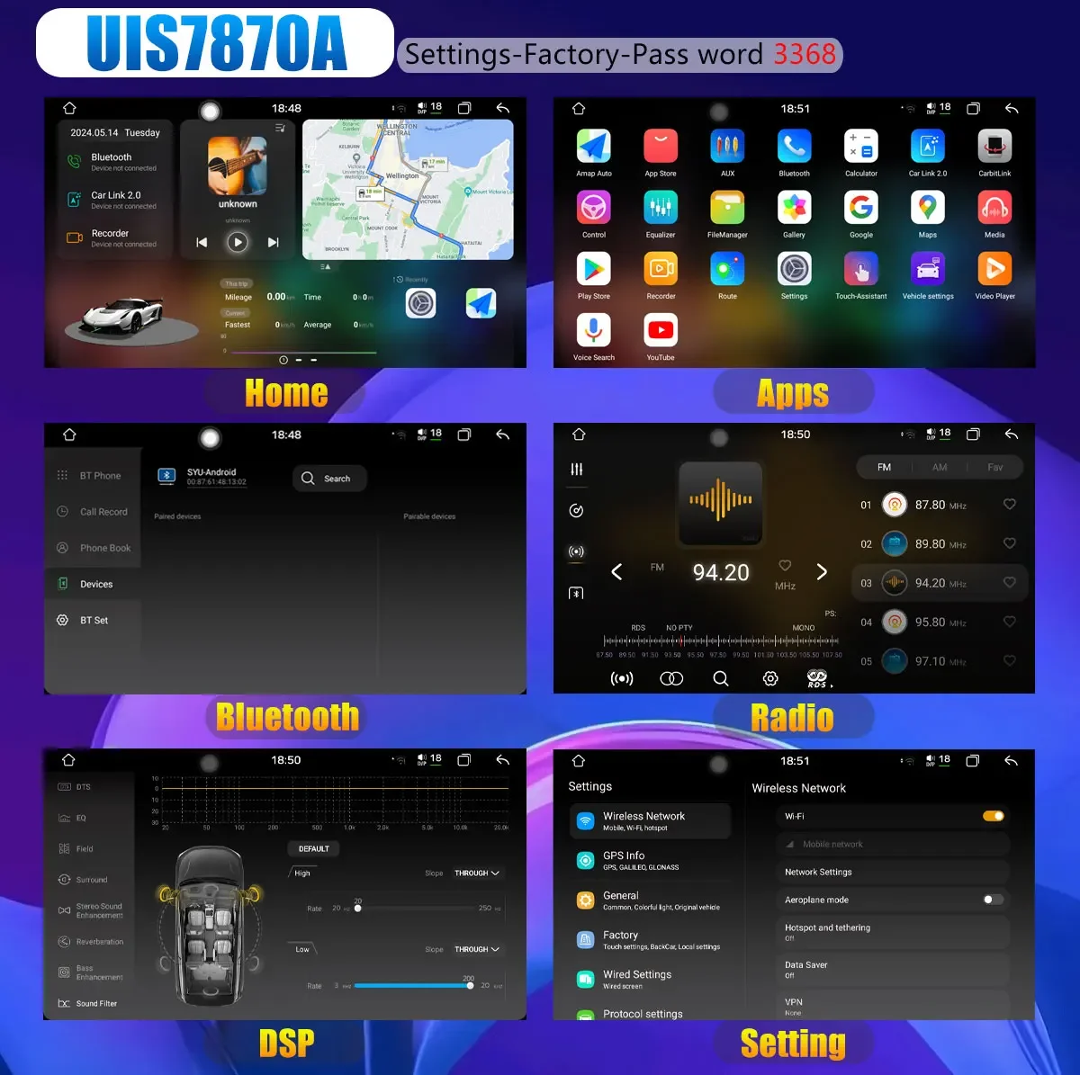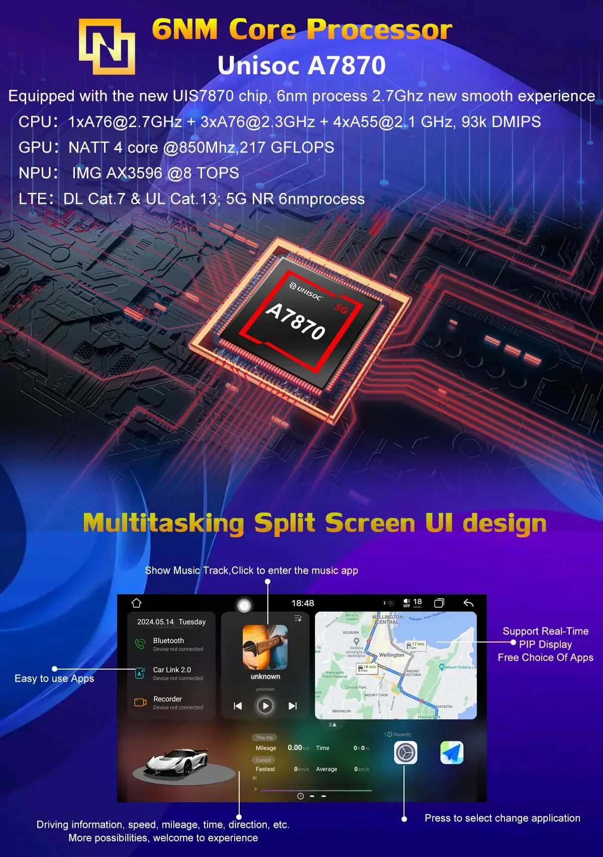 UIS7870:6nm 8Core 64Bit 6G+128G/8G+256G/12G+256G 4G LTE/WiFi Internet Typ C Lüfter Kühlung DSP CarPlay 3USB 360 Panorama Kamera Optional
