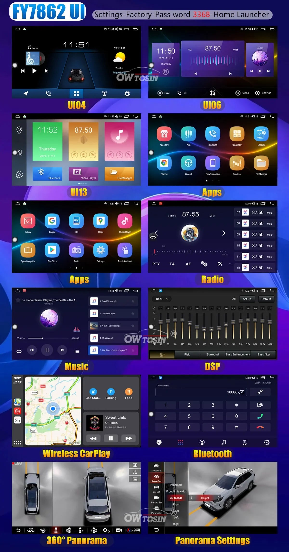 FY7862:8Core 64Bit 3G+32G/4G+64G/6G+128G/8G+128G/8G+256G4G LTE/WiFiInternetDSP CarPlay2USB 360 Panoramakamera optional